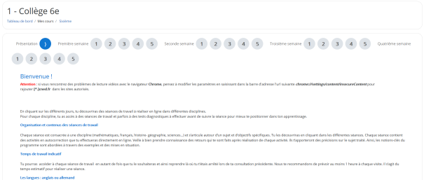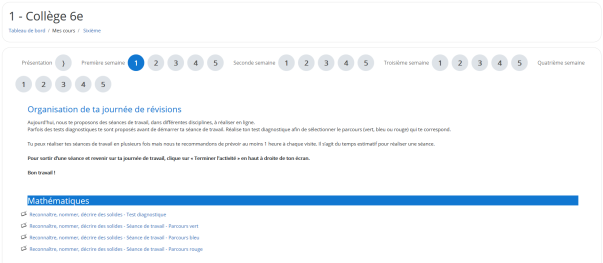 Ils sont répartis sur 4 semaines avec une proposition organisée en 5 parties liées différentes matières et comportant des activités qui peuvent être réalisées par les élèves en autonomie, ou de façon guidée via le cahier de texte et l'ENT.